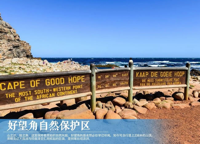【好望角】于開普半島南端,在保護(hù)區(qū)內(nèi),鐵銹色凹凸不平的地面上生長著一片片低矮的灌木叢和被稱為南非國花的山龍眼,狒狒、非洲旋角大羚羊等動(dòng)物間或在眼前一躍而過。在大西洋邊紅色的卵石灘上,時(shí)??梢婑匄B閑庭信步的可愛模樣。在保護(hù)區(qū)的西南端有一個(gè)如同伸入大西洋中巨大鱷魚爪的岬角。