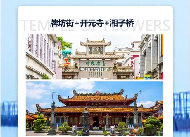 早餐后游覽【開(kāi)元寺】(游覽時(shí)間不低于30分鐘)位于鯉城區(qū)西街,是中國(guó)東南沿海重要的文物古跡,也是福建省內(nèi)規(guī)模較大的佛教寺院。該寺始創(chuàng)于唐初垂拱二年(686年),初名蓮花道場(chǎng),開(kāi)元二十六年(738年)更名開(kāi)元寺?,F(xiàn)存主要廟宇系明、清兩代修建,南北長(zhǎng)260米,東西寬300米,占地面積78000平方米?!疚鹘帧浚ㄓ斡[時(shí)間不低于30分鐘)是泉州較早開(kāi)發(fā)的街道和區(qū)域,早在宋朝,它就已經(jīng)象征了泉州的繁榮,它還是泉州市區(qū)保存較完整的古街區(qū),保留著大量具有歷史原貌的建筑。前往前往【蟳埔村】(游覽時(shí)間不低于60分鐘),蟳埔村位于福建省泉州市豐澤區(qū)東海社區(qū)的一條小漁村,這里居住的是古時(shí)阿拉伯人的后裔。這里的女人們頭上戴著鮮花做的漂亮的簪花圍,戴著丁香耳墜,穿著大裾衫、寬腳褲,形成了一道獨(dú)特的風(fēng)情,她們和惠安女、湄州女一起并稱福建三大漁女,這里還有別具特色的民居“蚵殼厝”。體驗(yàn)潯埔村地方民俗,風(fēng)土人情。【女士贈(zèng)送插花,體驗(yàn)潯埔漁村民俗】隨后前往平潭酒店入住休息。