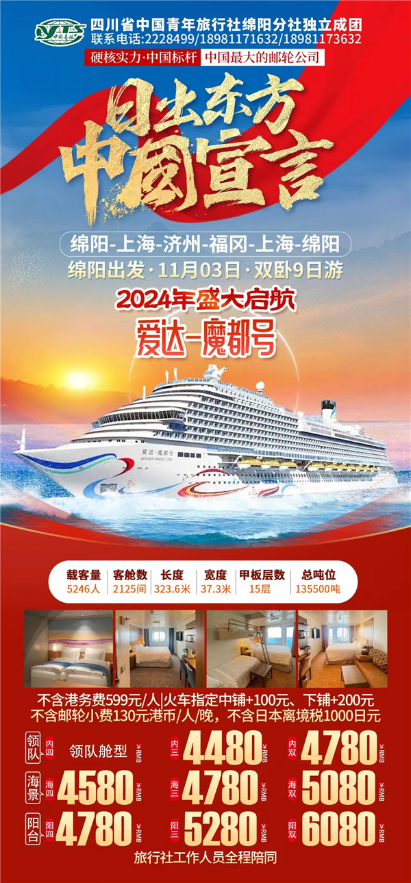 綿陽中旅假日旅行社于2024年10月9日在市工會大廈成功舉行“愛達(dá)·魔都號豪華郵輪9日游”旅游線路推薦會?,F(xiàn)場主持人向到場的嘉賓們詳細(xì)的介紹了濟(jì)州、福岡等地的風(fēng)土人民、美食、美景以及出游的相關(guān)注意事項(xiàng)等內(nèi)容,受到了嘉賓們的熱烈歡迎和關(guān)注。服務(wù)熱線:0816-2228499/2238477 。